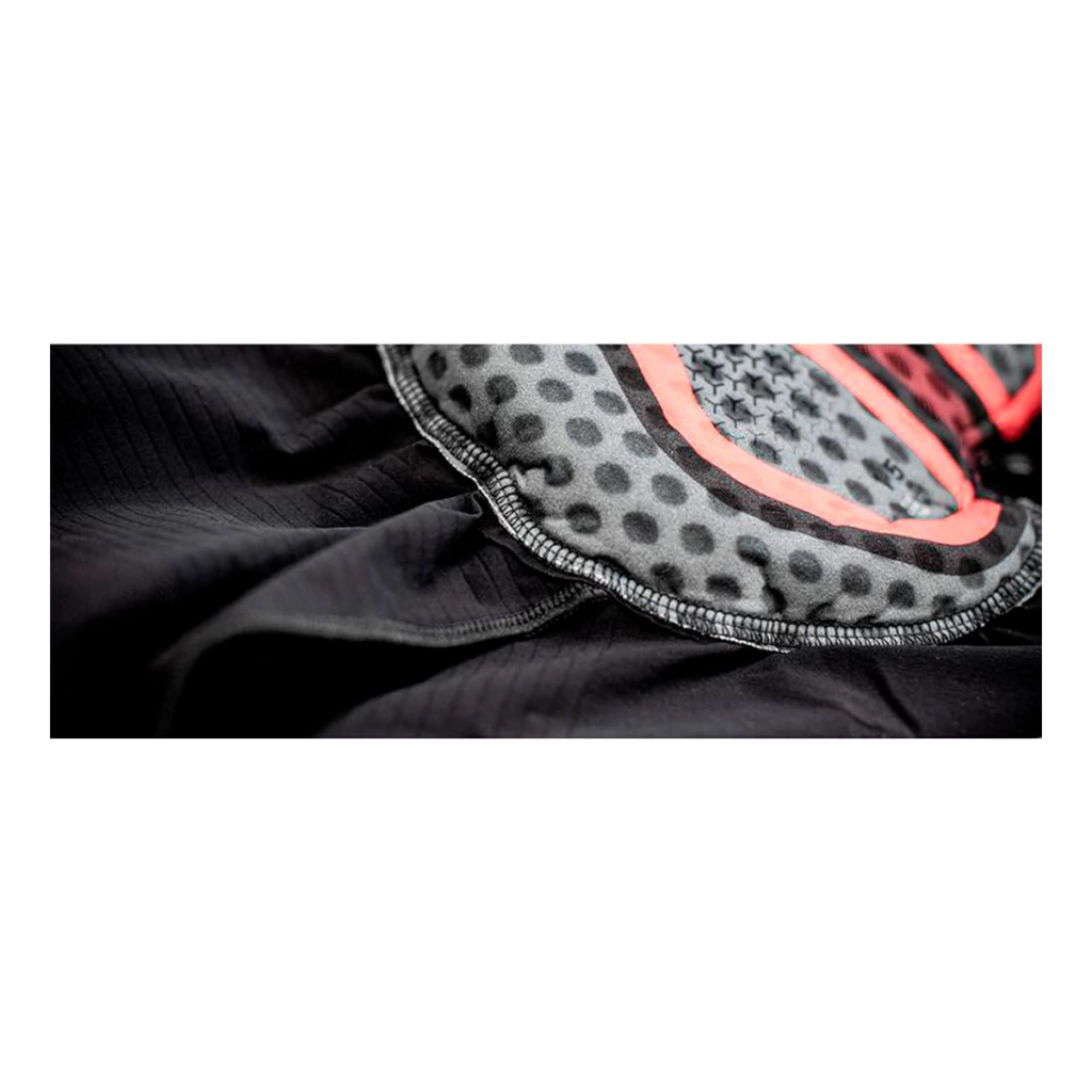 Projetamos um novo tecido que muda dependendo das necessidades de várias partes do corpo. A parte inferior da perna tem uma extremidade cortada e fios emborrachados para garantir uma pegada plana para manter a perna no lugar. O tecido fica mais leve na coxa, enquanto o alongamento nas quatro direções fornece a quantidade certa de suporte muscular. Na área da pelve, a compressão e o suporte aumentam para manter a almofada do assento e tudo o mais no lugar. Na parte de trás há um tecido mais grosso para evitar problemas de transparência.