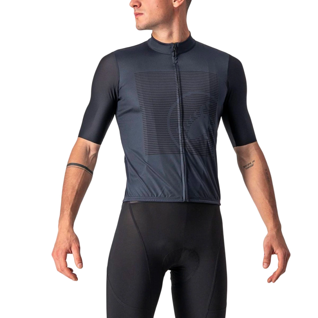 Não é sua camisa gráfica padrão. Começamos com tecidos tingidos por peças para uma rica saturação de cores, mas não apenas um único tecido: a camisa do corpo principal tem o tratamento ProSecco da Castelli para mantê-lo mais seco, os painéis laterais de malha proporcionam elasticidade e ventilação extra e as mangas são em quatro tecido Way-Stretch Velocity Rev2 tirado diretamente da nossa camisa Aero Race 6.0 vencedora do Tour de France. É um kit de alto desempenho. O gráfico é adicionado à frente através de um processo de sublimação, mas neste caso é uma sobreimpressão nos tecidos tingidos para um visual mais rico e sutil. O bloco gráfico na frente lembra uma camiseta serigrafada, então você tem a justaposição de um gráfico estilo camiseta em uma camisa de alto desempenho.