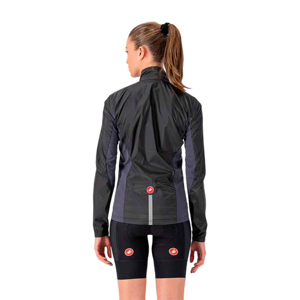 Detalhes refletivos no peito e na parte inferior das costas para visibilidade com pouca luz.