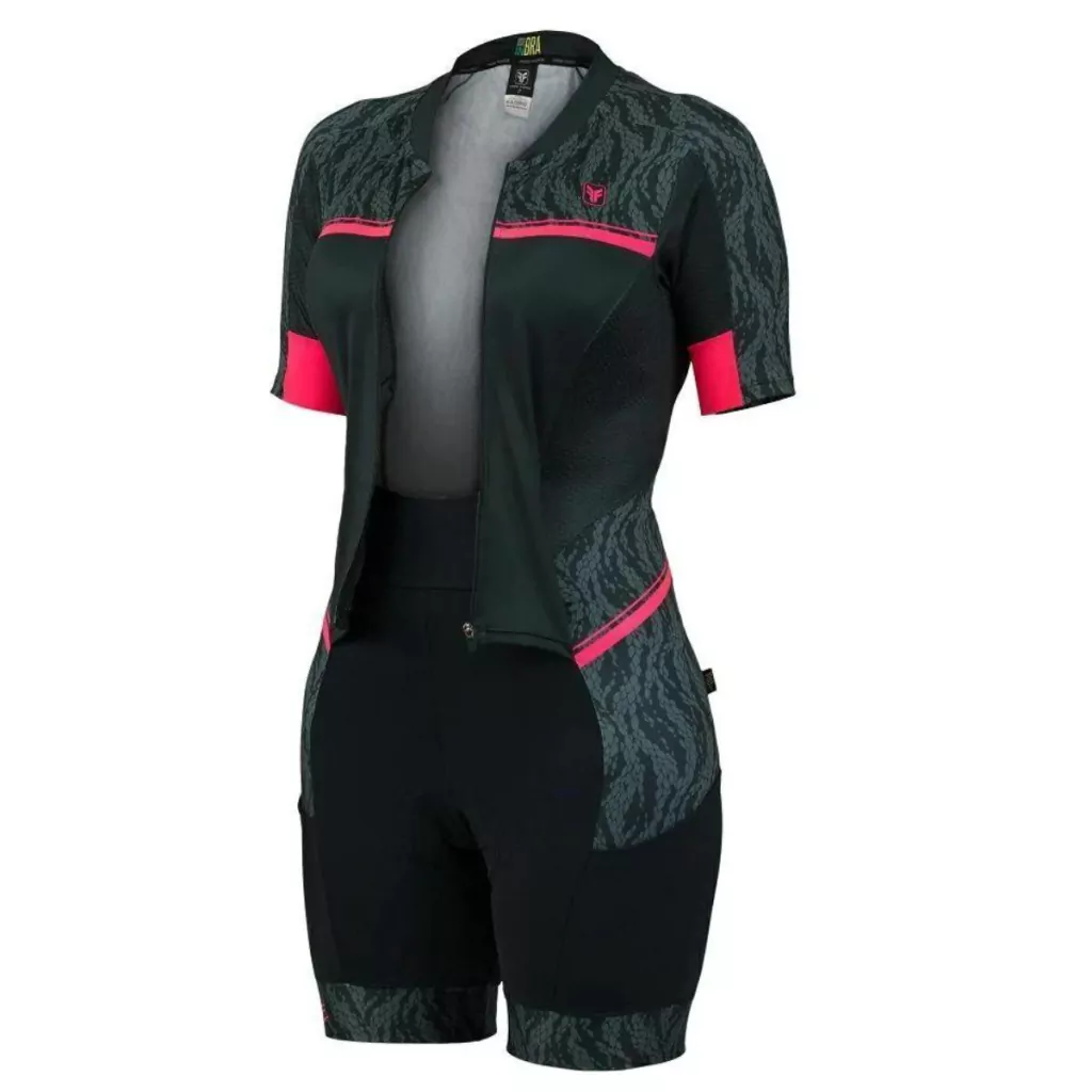 O macaquinho de ciclismo feminino Free Force Hide foi desenvolvido com malhas flexíveis e com fios opacos na parte de baixo, além de detalhes funcionais como refletivos, silicone na barra para fixação e bolsos laterais, que comportam celulares e pertences pessoais, de fácil acesso e seguros.